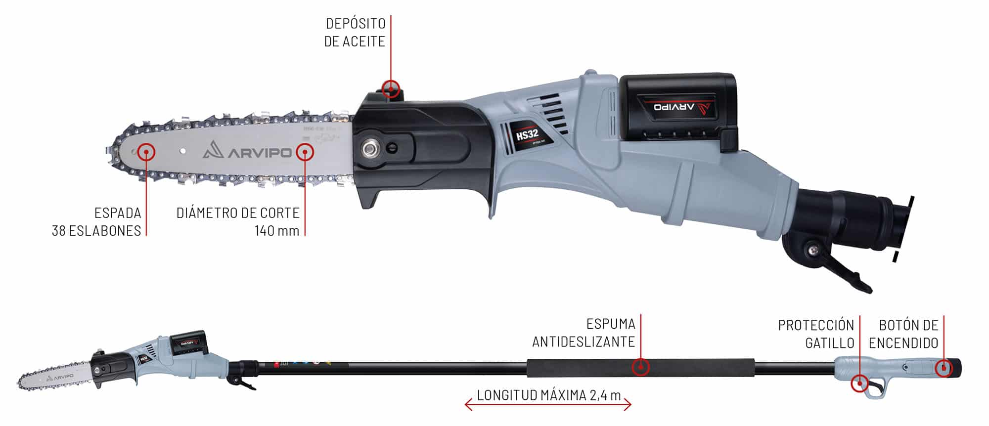 Es la pareja perfecta para la tijera ARVIPO PS32 para una poda fácil y muy eficiente, con la que comparte batería para su mejor aprovechamiento.