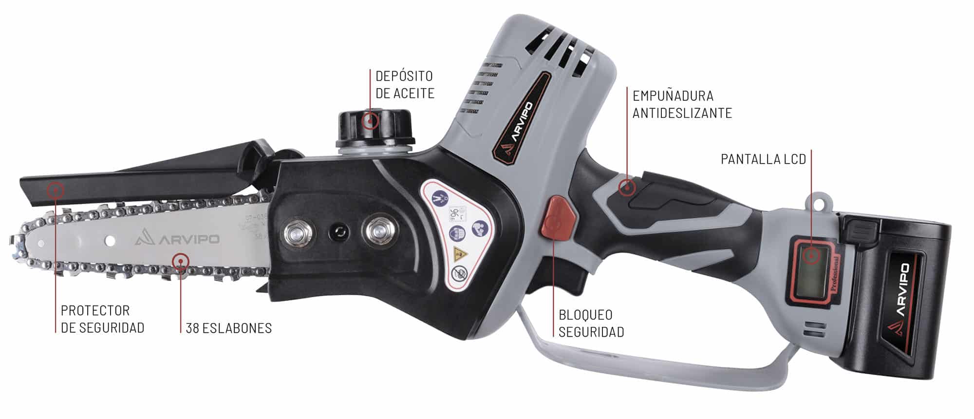 Perfecto complemento a la tijera eléctrica ARVIPO PS37, con la que hace un equipo completo de poda profesional al compartir batería.
