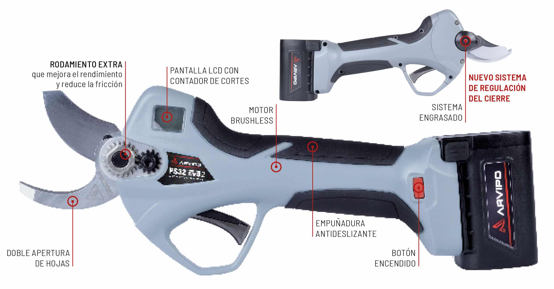 Tijera de podar eléctrica con batería incorporada en la propia tijera. Rápida y potente, pantalla integrada en la tijera con indicador de batería y cortes realizados.