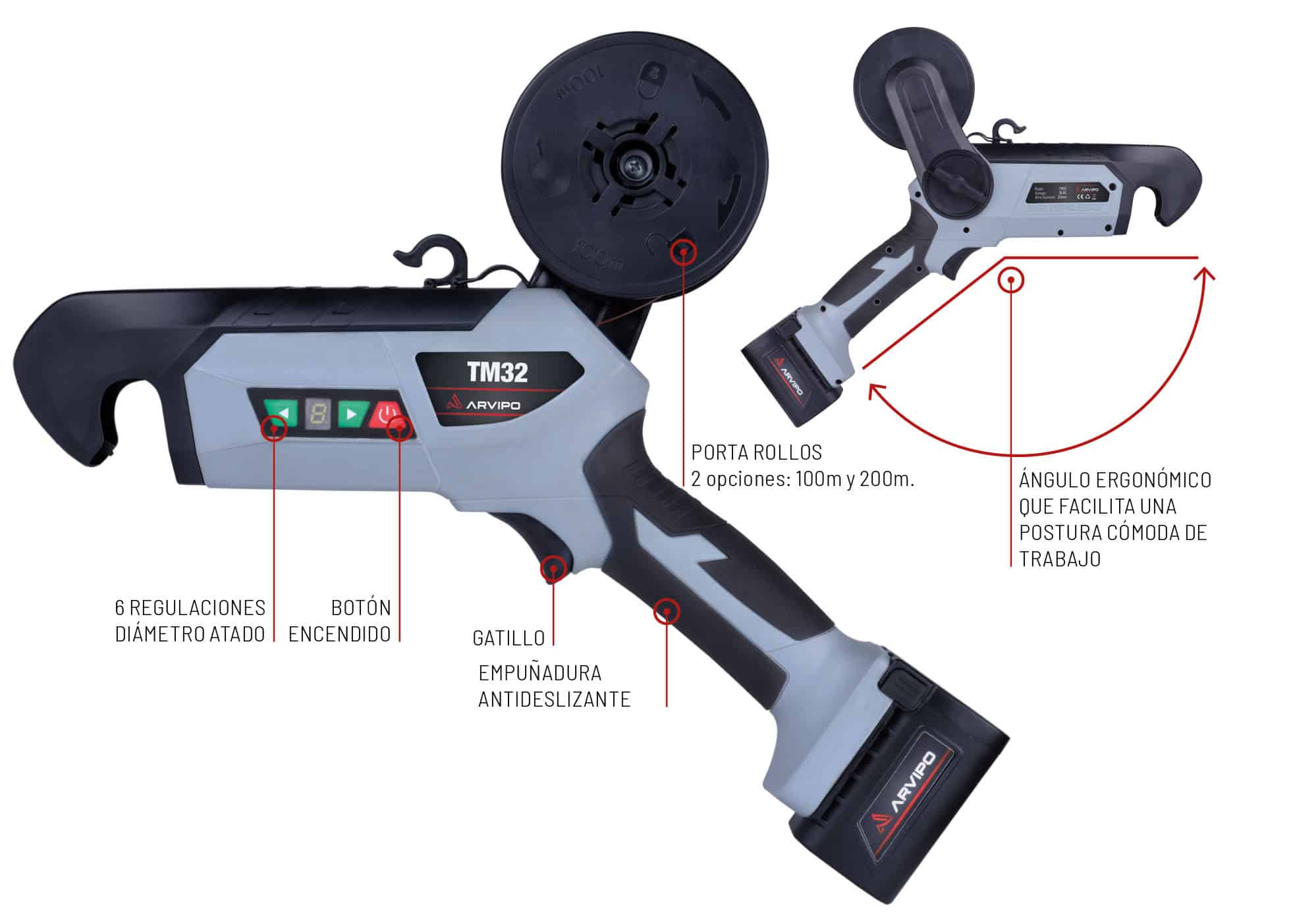 Nueva incorporación a la familia 32. La atadora ARVIPO TM32 llega con un diseño óptimo en ergonomía que se va a trasladar en una mayor comodidad en este duro trabajo.